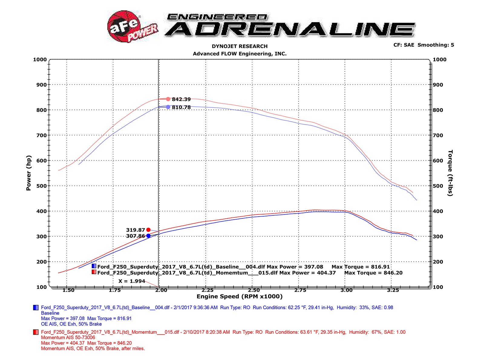 AFE's Momentum HD Pro 10R cold air intake system uses a high quality, dyno-tuned intake tube to achieve maximum power gains while maintaining a perfect fit. The smooth one-piece high quality sealed housing with auxiliary air scoop is used to eliminate the use of multiple-piece housings and ensure the coolest air intake charge available. A large, clear sight window is used for a hassle-free filter inspection and an aggressive style. A urethane plug is also included if you wish to block off the auxiliary air inlet. (US PAT 9440175) For Filter-to-Housing Interface. The Momentum HD intake is designed around a massive 1,000cfm performance 360-degree radial flow air filter with 10-layers of progressive cotton media providing 99.59% cumulative efficiency (independently tested). The unique air filter to housing interface (patent pending) allows for maximum filter size which increases the available air volume while simplifying the installation process. The air filter is wrapped in reinforced metal providing maximum strength to prevent filter collapse. Premium clamps and a silicone elbow coupling are used for strength and flexibility while also providing the most secure installation available. Momentum intakes are designed with fewer parts for a quick and simple installation.
