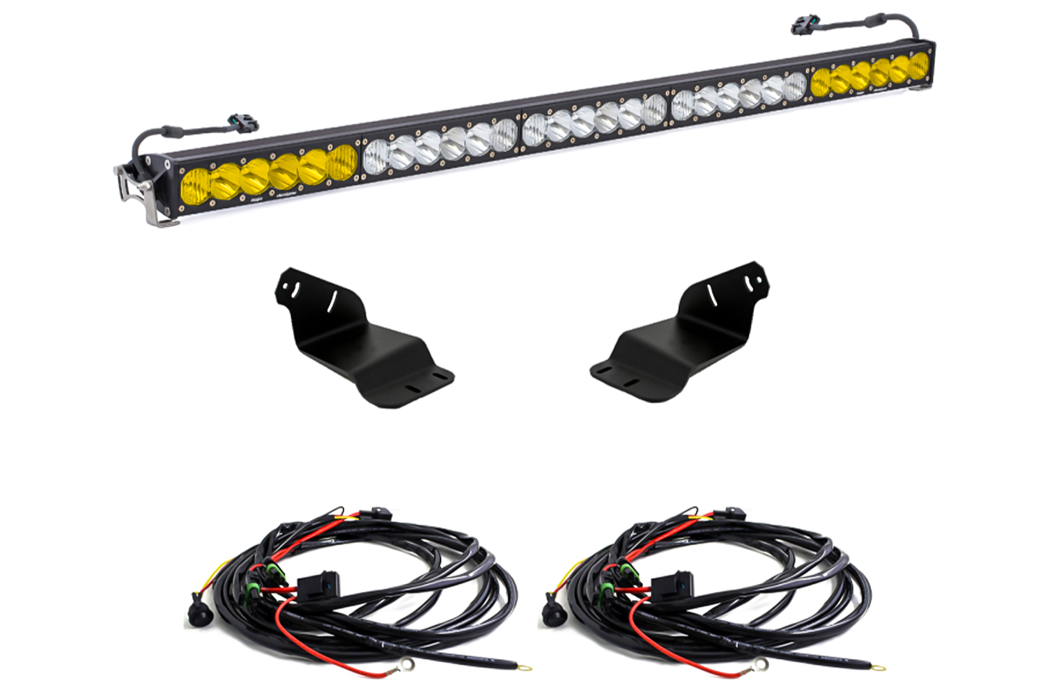 Great light pattern. The OnX6+ lightbar included in the kit is a 50-inch straight light bar. It features Baja Designs clear and amber driving/combo lenses to project a light pattern that aids in nearly any adventure. A look at the lightbar will reveal that the lens features both spot and wide-angle cornering designs to produce both an intense far-reaching pattern and a wide pattern. This gives you the best visibility possible and is fitting for almost any situation.