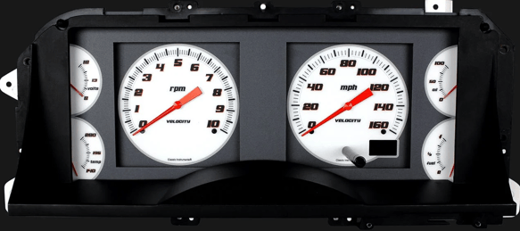 Looking for an upgrade for your 1987-1989 Fox Body Mustang's factory gauge cluster? Classic Instruments has the perfect solution with their OEM style Velocity White gauge cluster kit. This gauge cluster is fully-electronic, feature-packed, and features a 160MPH speedometer and 10K RPM tachometer; perfect for your high horsepower Fox Body project car. Featuring white gauges, a gray & black housing, and all necessary sending units, this gauge cluster will have your Mustang's cockpit looking like new in no time.