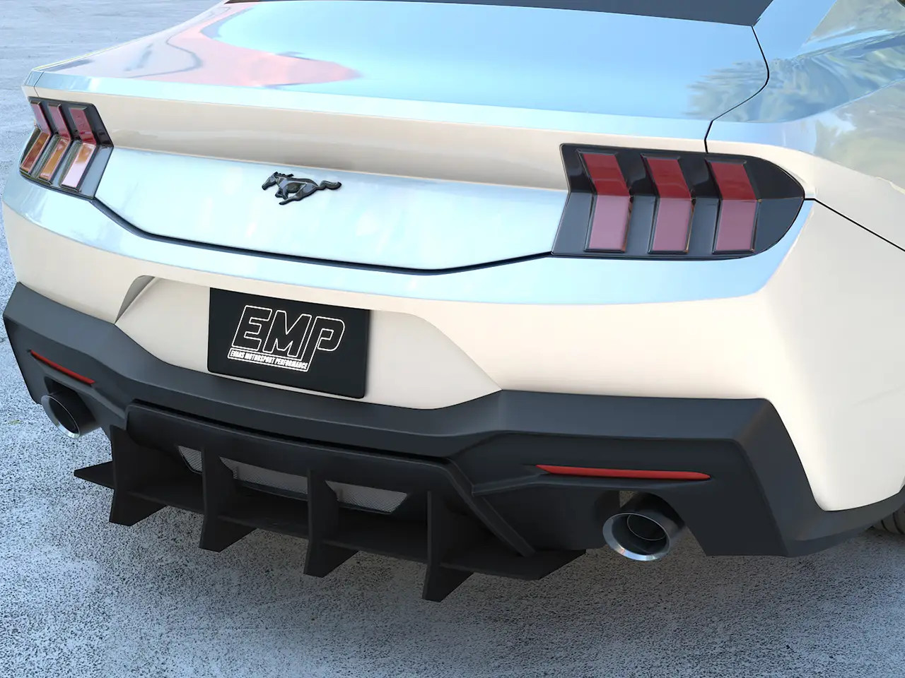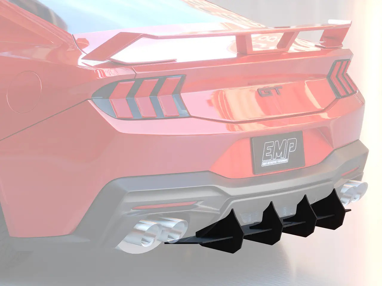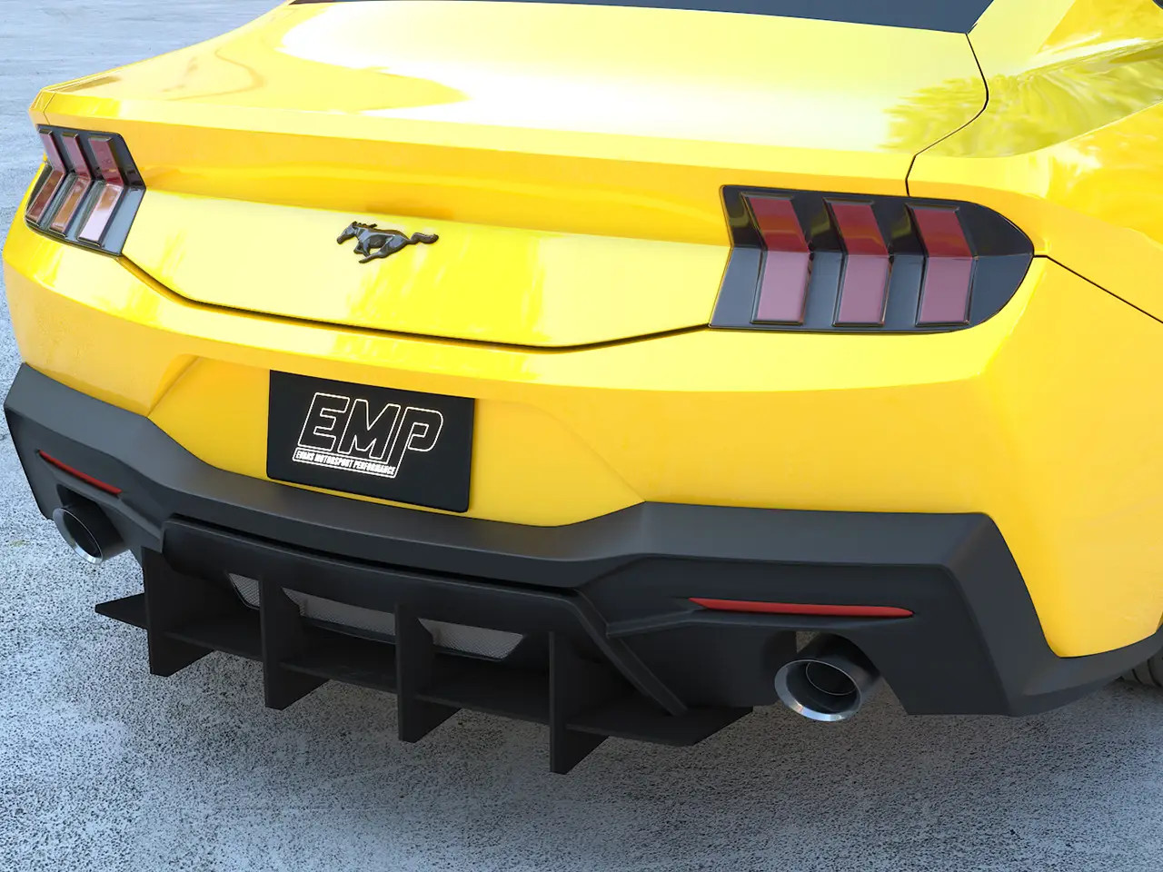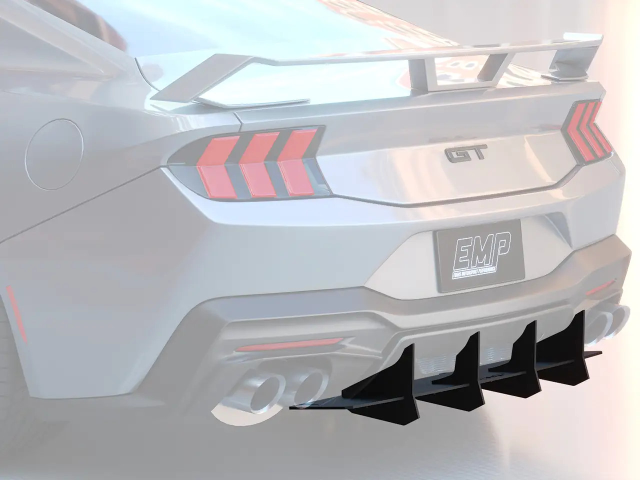 Enhance the form and function of your 2024-2026 S650 Mustang GT or EcoBoost's rear end with EMP's HDPE Rear Diffuser. This rear diffuser features a menacing profile with large vertical aero fins that will make your Mustang stand out from the crowd. Not only does this piece look the part, but EMP spared no expense ensuring its fit and finish is top-notch. Unlike other solutions on the market, this one has pre-drilled mounting holes for a super simple install. It also features a slotted attachment design to help you get the center section perfectly aligned, and this allows you to adjust how far the diffuser extends back past your rear bumper. To further solidify the strength of this rear diffuser, it was taken on a test lap at the Daytona 500 where it survived a blistering 155mph with ease. EMP provides all necessary stainless steel hardware for installation, and manufactures this kit right here in the USA.