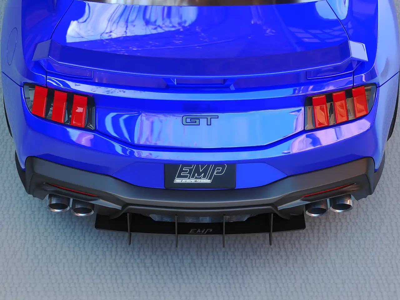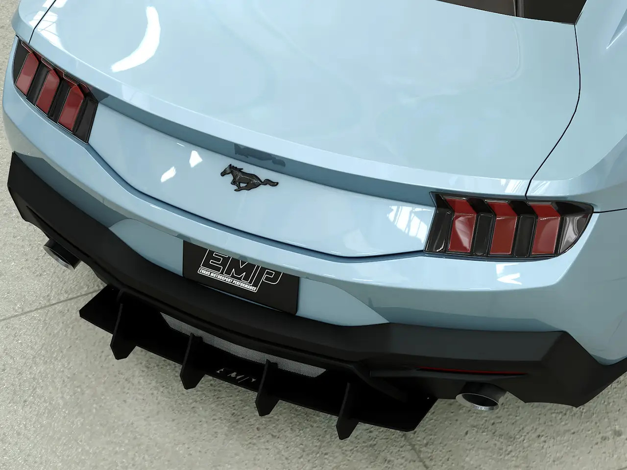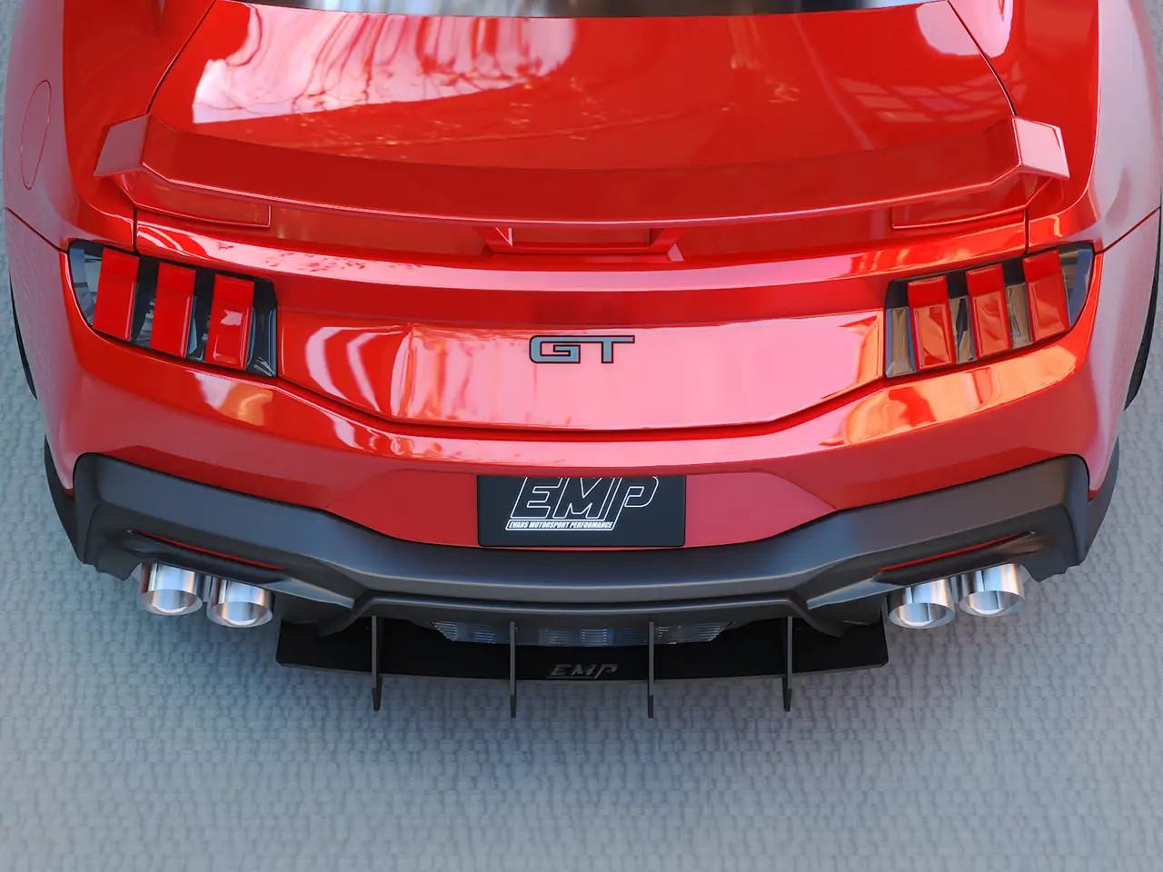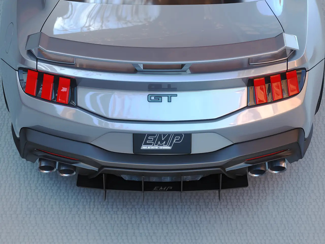 Enhance the form and function of your 2024-2026 S650 Mustang GT or EcoBoost's rear end with EMP's HDPE Rear Diffuser. This rear diffuser features a menacing profile with large vertical aero fins that will make your Mustang stand out from the crowd. Not only does this piece look the part, but EMP spared no expense ensuring its fit and finish is top-notch. Unlike other solutions on the market, this one has pre-drilled mounting holes for a super simple install. It also features a slotted attachment design to help you get the center section perfectly aligned, and this allows you to adjust how far the diffuser extends back past your rear bumper. To further solidify the strength of this rear diffuser, it was taken on a test lap at the Daytona 500 where it survived a blistering 155mph with ease. EMP provides all necessary stainless steel hardware for installation, and manufactures this kit right here in the USA.