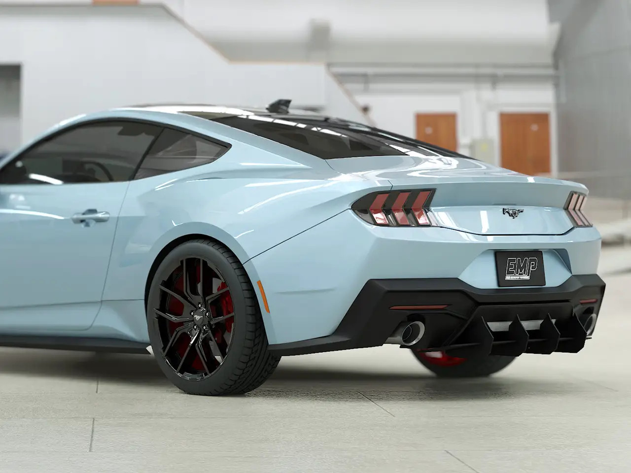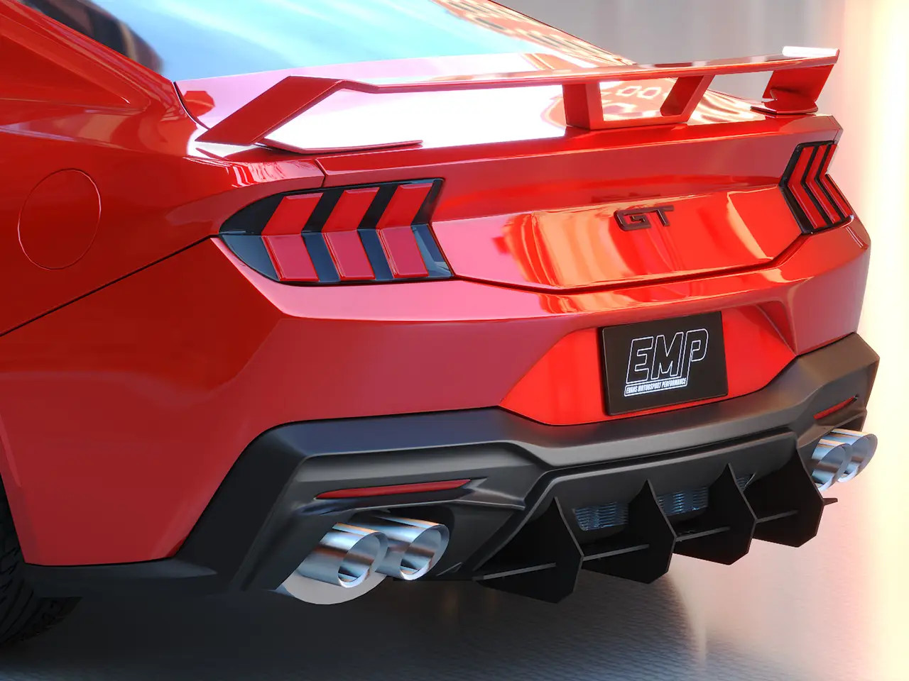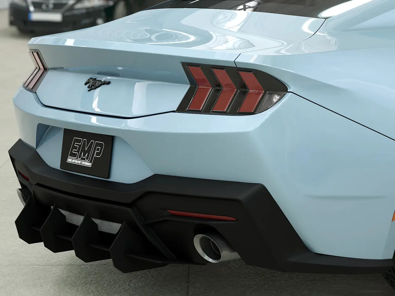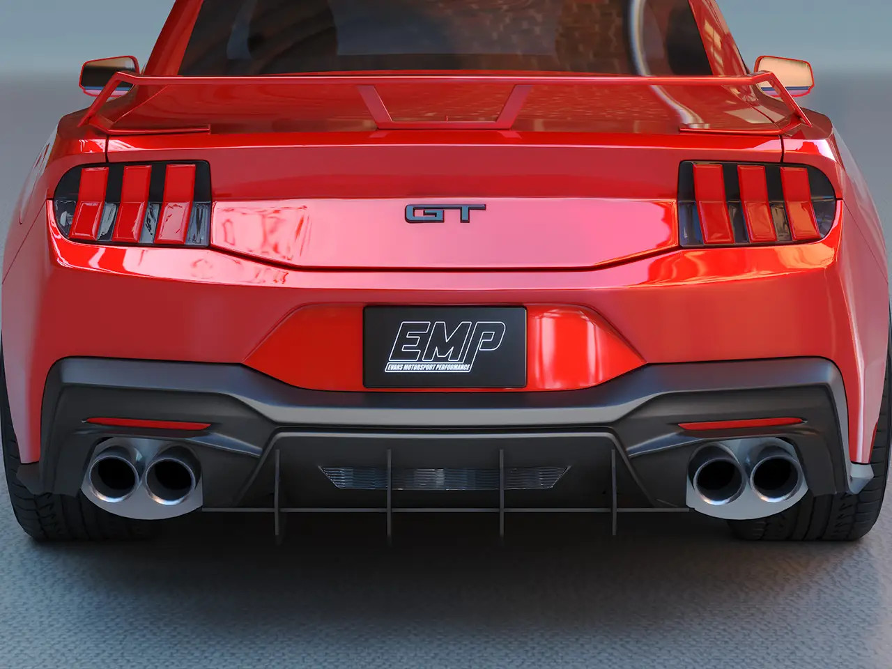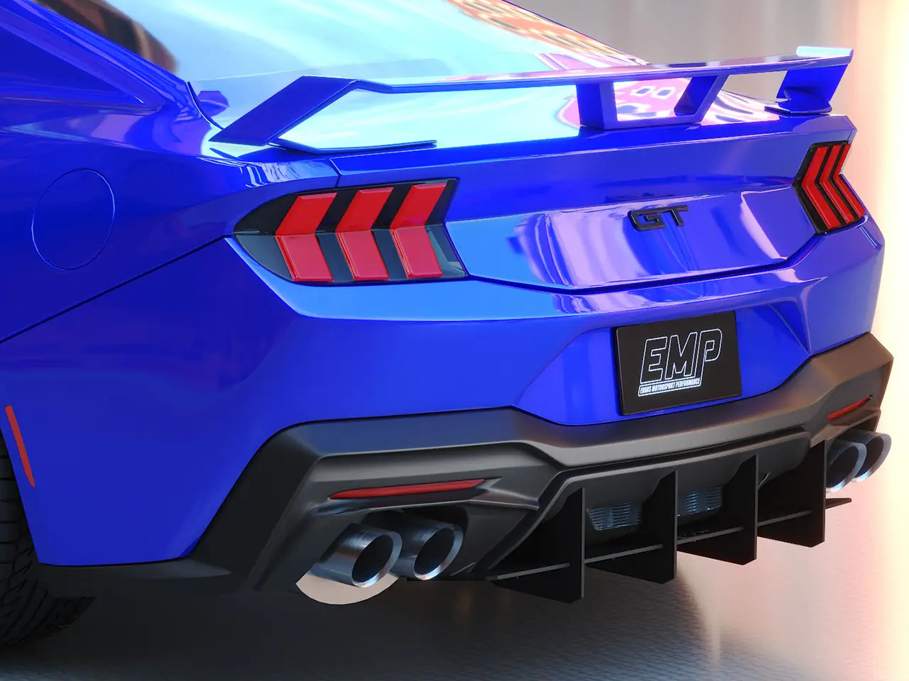 Enhance the form and function of your 2024-2026 S650 Mustang GT or EcoBoost's rear end with EMP's HDPE Rear Diffuser. This rear diffuser features a menacing profile with large vertical aero fins that will make your Mustang stand out from the crowd. Not only does this piece look the part, but EMP spared no expense ensuring its fit and finish is top-notch. Unlike other solutions on the market, this one has pre-drilled mounting holes for a super simple install. It also features a slotted attachment design to help you get the center section perfectly aligned, and this allows you to adjust how far the diffuser extends back past your rear bumper. To further solidify the strength of this rear diffuser, it was taken on a test lap at the Daytona 500 where it survived a blistering 155mph with ease. EMP provides all necessary stainless steel hardware for installation, and manufactures this kit right here in the USA.