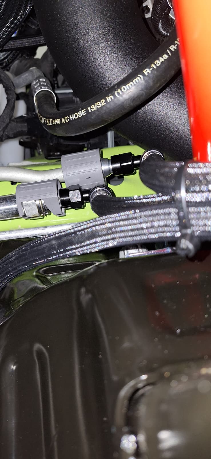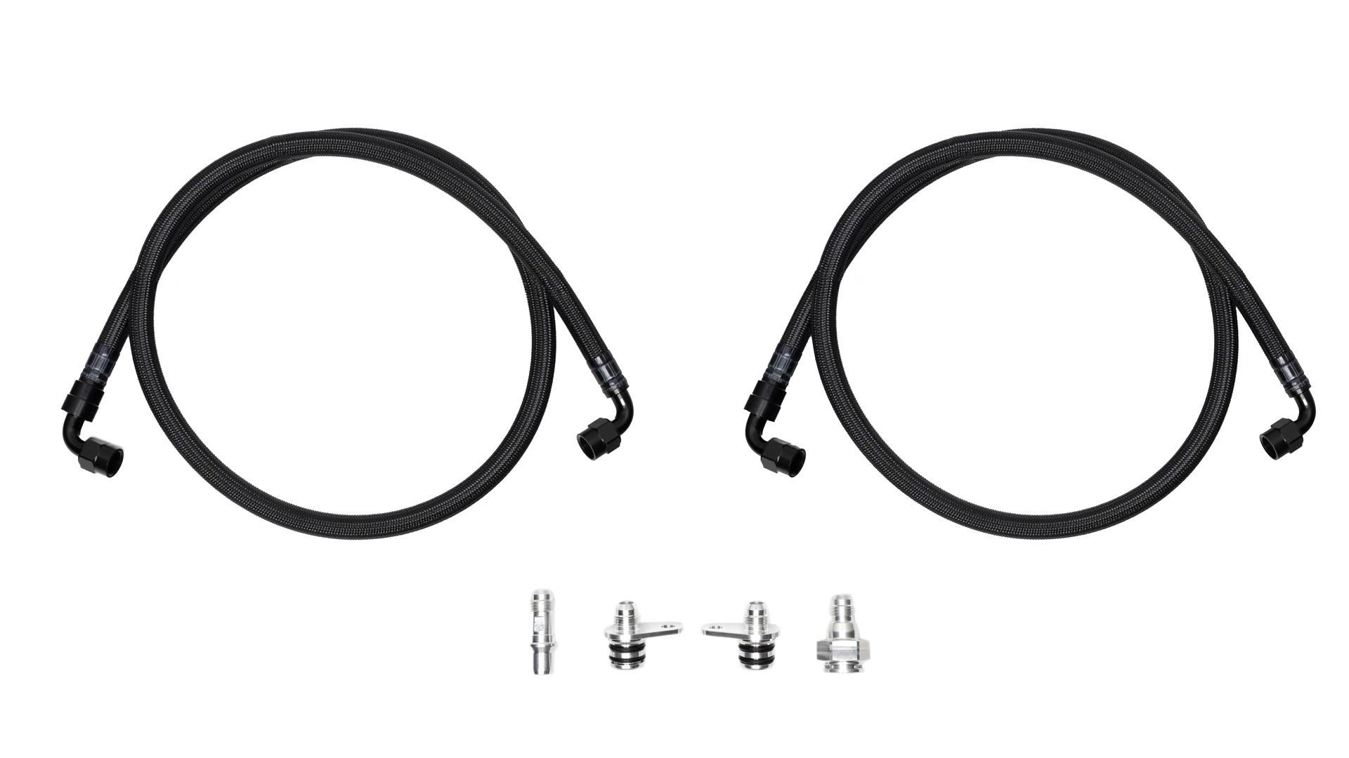 Upgrade your 2020-2022 Mustang GT500's transmission cooler lines with this kit from Fathouse Performance. This transmission cooler lines kit includes everything you need to convert your GT500's factory hard lines to high temperature braided lines for more flexibility and better fitment when installing twin turbo kits, and to prevent future leaks that the OEM hard lines are known to do. These transmission cooler lines feature a high temperature polymer construction with a braided outer layer for maximum strength and reliability, and come pre-assembled with crimped fittings. Fathouse also gives your O-ringed metal connection fittings for a straightforward installation. If you need some extra clearance for mounting a bottom mount twin turbo system, these flexible transmission lines are a no-brainer.