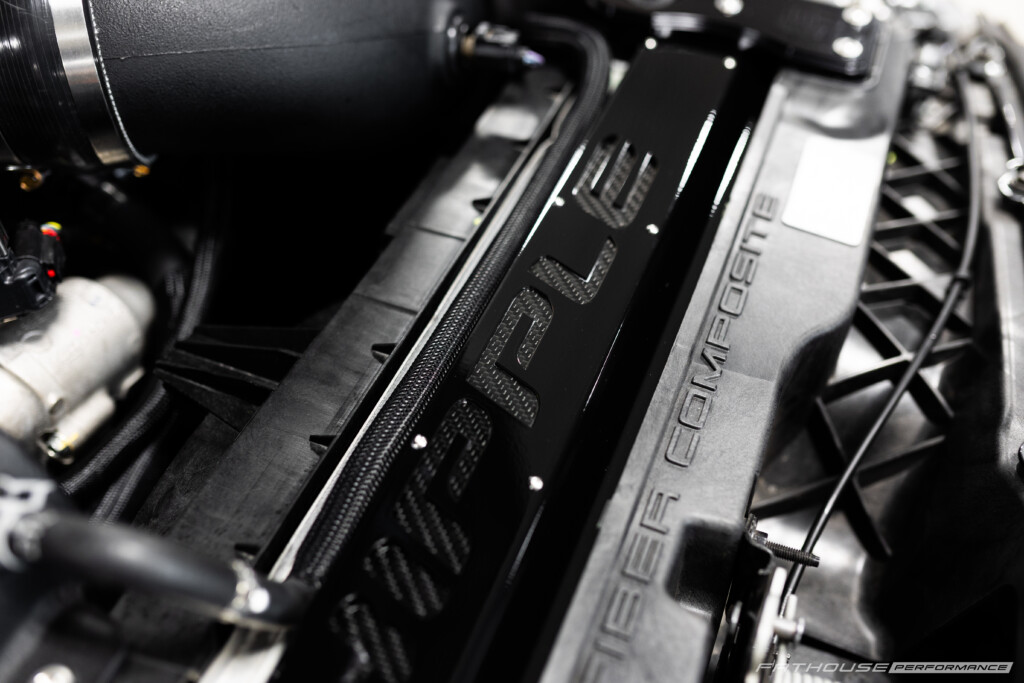 Premium Design: Fathouse spared no expense in developing and manufacturing their radiator plates. This vanity plate features a two layer design both for durability and endless color combinations. They start with raw 304 stainless steel sheets that are laser cut and CNC bent for a precise fit, and the top layer is powder coated black to blend in seamlessly with your engine bay's other components. The bottom layer is left with a 2B finish that is seen through the cut out WHIPPLE text on the top layer, meaning you can customize the bottom plate to have the text in any color or finish you like. Fathouse offers the bottom backing plate layer with a carbon fiber finish, American flag, or almost every factory S550 color available for a perfect paint match. The two layers are bolted together with the included stainless steel hardware, and the whole piece attaches to your car using factory hardware. If you've already got (or want to add) Fathouse's billet radiator support brackets, this plate is fully compatible and will compliment the look.