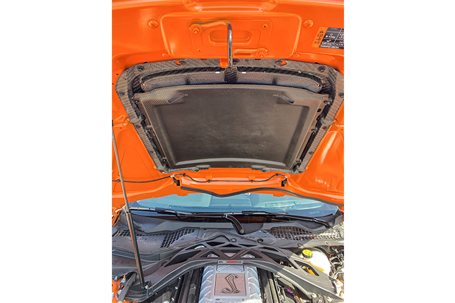 Exterior and underhood. The kit includes both a gloss carbon fiber heat extracting vent and a matte carbon fiber rain tray. This gives your car that premium and exotic style whether you have the hood up or down.