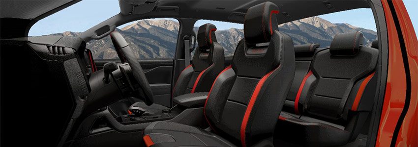 tailgate near the RAPTOR graphics on the rear fenders of the truck. As rugged as the exterior of the Ranger Raptor is, the interior is incredibly luxurious. The Raptor