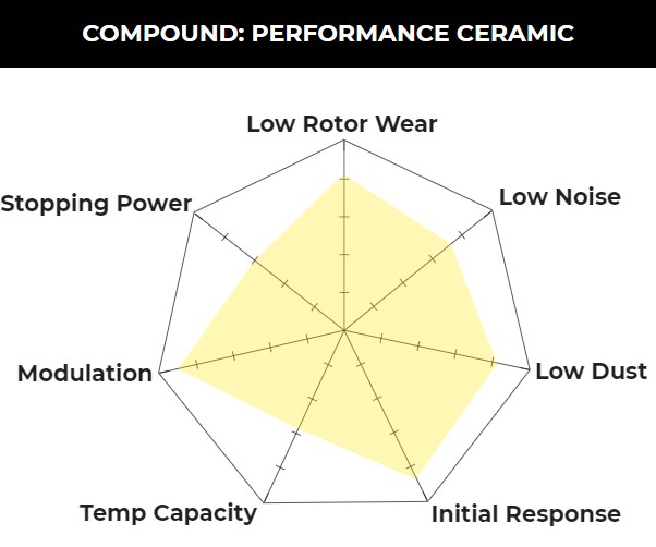 Designed for the street. Performance Ceramic pads help to reduce noise, vibration, and harshness (NVH) from your brakes and will not generate much dust. Great for enthusiasts that prefer better ride quality, less maintenance, and comfortable cruising.
