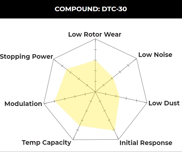 Great cold performance. The DTC-30 pad offers great performance when cold and is the perfect pad for a split-friction set up on your Mustang. Expect medium torque from the brake pad to help you rein in your S550 when entering corners.