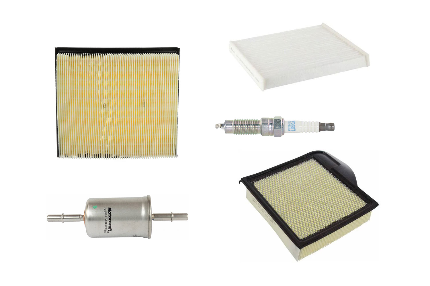 - Includes spark plugs, engine air filter, fuel filter, and cabin air filter