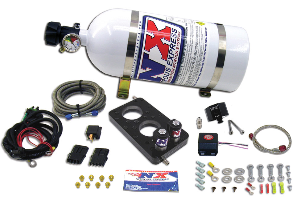 To make installation even easier, a billet fuel rail adapter is included so there is no need to splice into the factory fuel lines. The system includes jetting from 35 to 150 horsepower and can be upgraded to 200 horsepower with additional jets. Includes a 10lb. bottle, braided stainless lines, stainless bottle brackets, four color installation manual, arming switch as well as every nut, bolt and electrical connector needed to complete the installation.