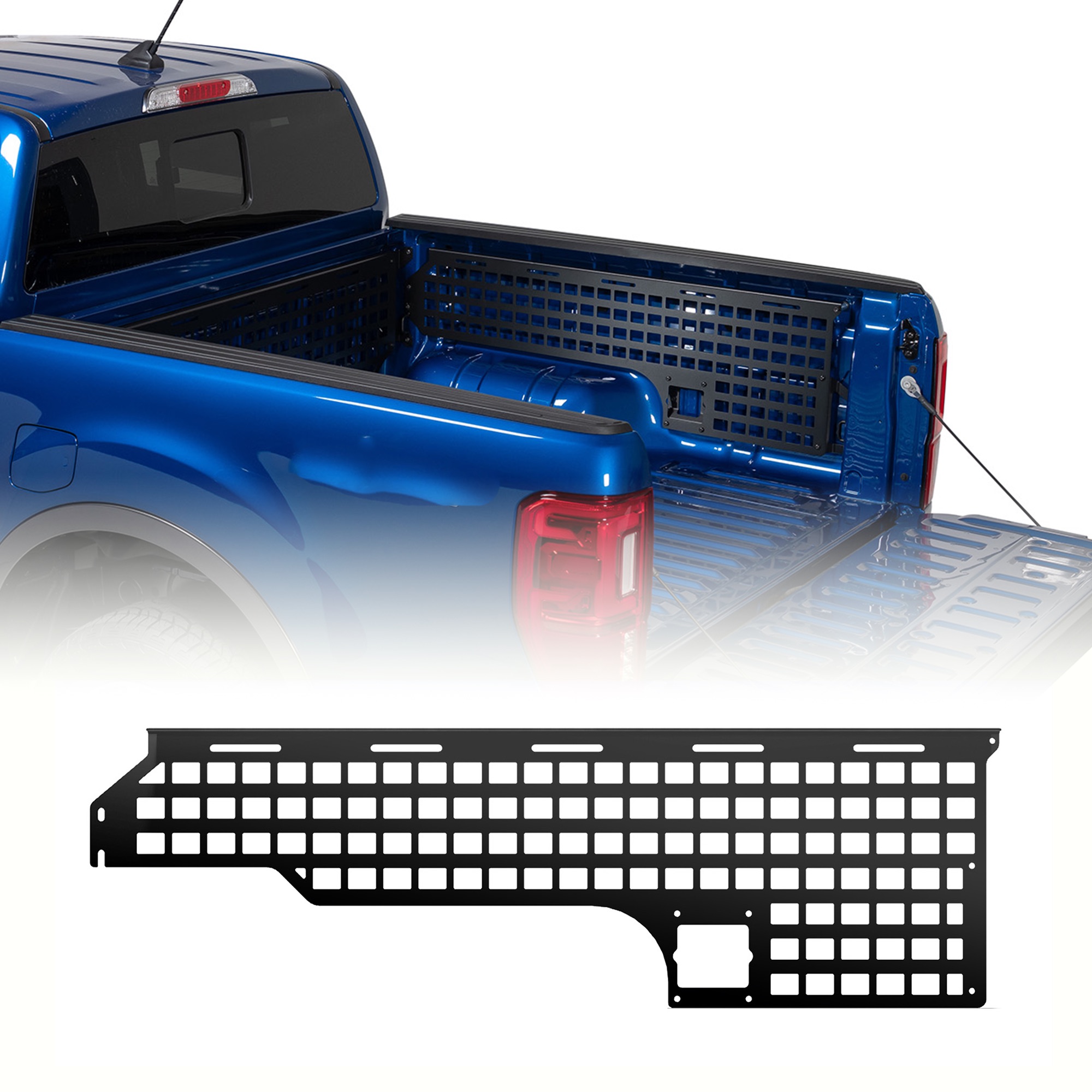 Outfit your 2019-2025 Ranger's 6ft bed with this MOLLE panel from Putco to unlock endless adventure, modular storage, or hauling capabilities. This MOLLE panel mounts directly to your Ranger's bed on the passenger side and gives you an infinitely customizable modular storage system; perfect for storing commonly used tools, camping gear, recovery equipment, and other essentials. There's no end to the amount of aftermarket accessories that are compatible with the MOLLE system, including Putco's own MOLLE mounts, Milwaukee's Packout systems, and accessories from Quickfist, Kolpin, Hi-Lift, Maxtrax, and RotopaX. Putco manufactures their MOLLE panels right here in the USA from laser cut 20-gauge 6061 aluminum for a precision fit, and superior durability while remaining lightweight. Installation is super simple thanks to the 100% bolt-on design that requires no drilling or cutting. Their panels are also powder coated black for superior corrosion and wear & tear resistance, and are protected by Putco's NeveRust limited lifetime warranty, as well as their standard 3-year limited warranty.