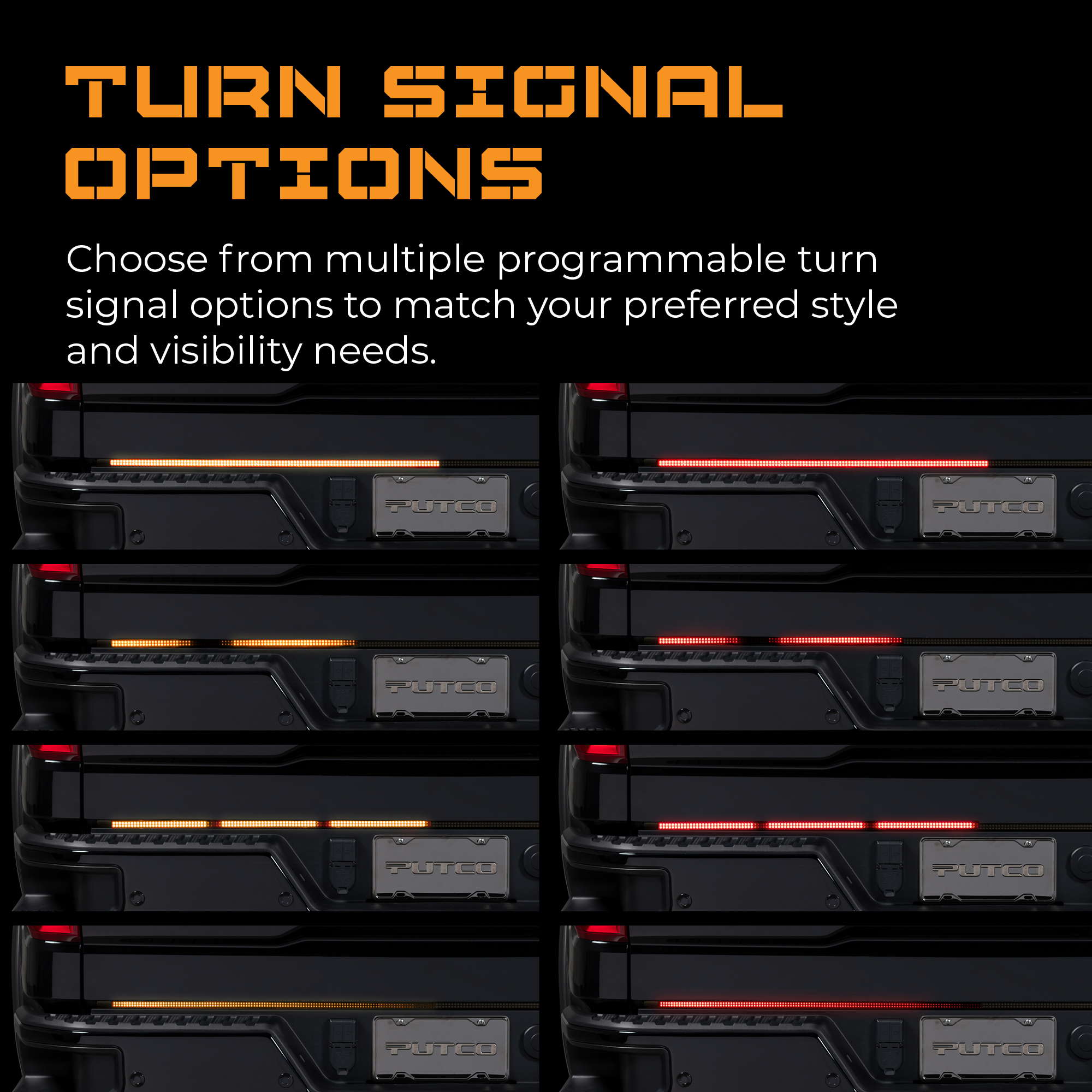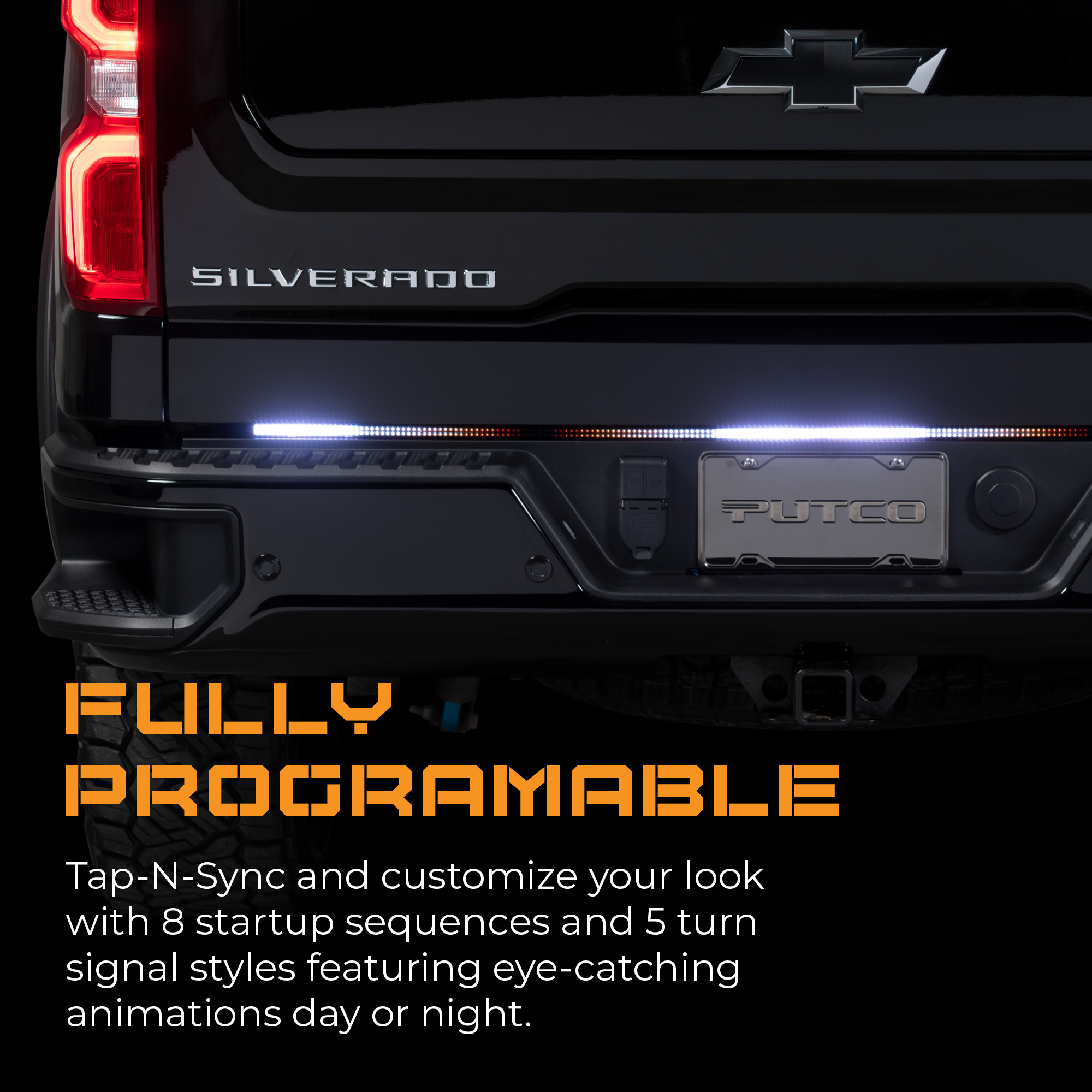Upgrade your 2021-2023 F-150's rear end styling and functionality with Putco's 60" Freedom Blade LED tailgate light bar. This light bar gives your truck's rear end a functional upgrade by integrating seamlessly with your OEM turn signals, brake lights, reverse lights, running lights, and hazards. Not only will the light bar respond to your regular inputs, but you can also choose from either amber or red turn signals, 5 different turn signal styles, as well as enable a triple pulse brake light for added safety. When in reverse, the LEDs shine with a 6,000K cool white light to increase visibility during late night outings. As the name implies, the hallmark feature of the Freedom Blade is the Freedom to choose from 8 start-up sequences to truly customize your driving experience. Unlike other light bars on the market, the Freedom Blade features a fully encapsulated polycarbonate resin design that serves to protect the LEDs from the outside elements, and provide ample flexibility and durability to adhere to the contours of your truck's rear when installing. Installation is made super simple with the included plug-n-play wiring harness and pre-applied 3M adhesive. Finally, this light bar is DOT/SAE compliant, designed and manufactured right here in the USA, and comes with a 3-year warranty.