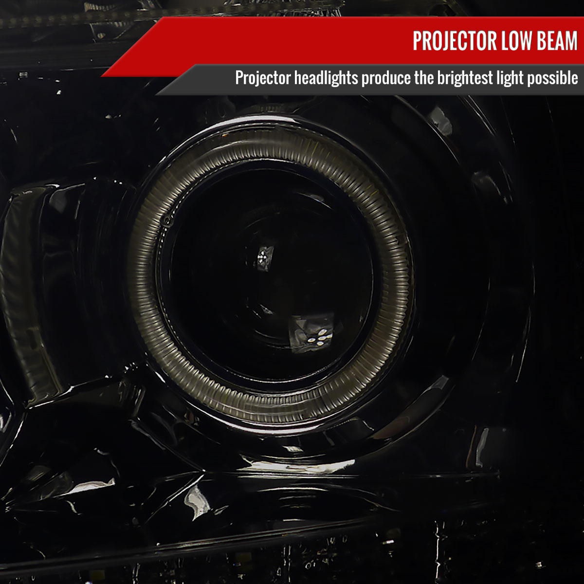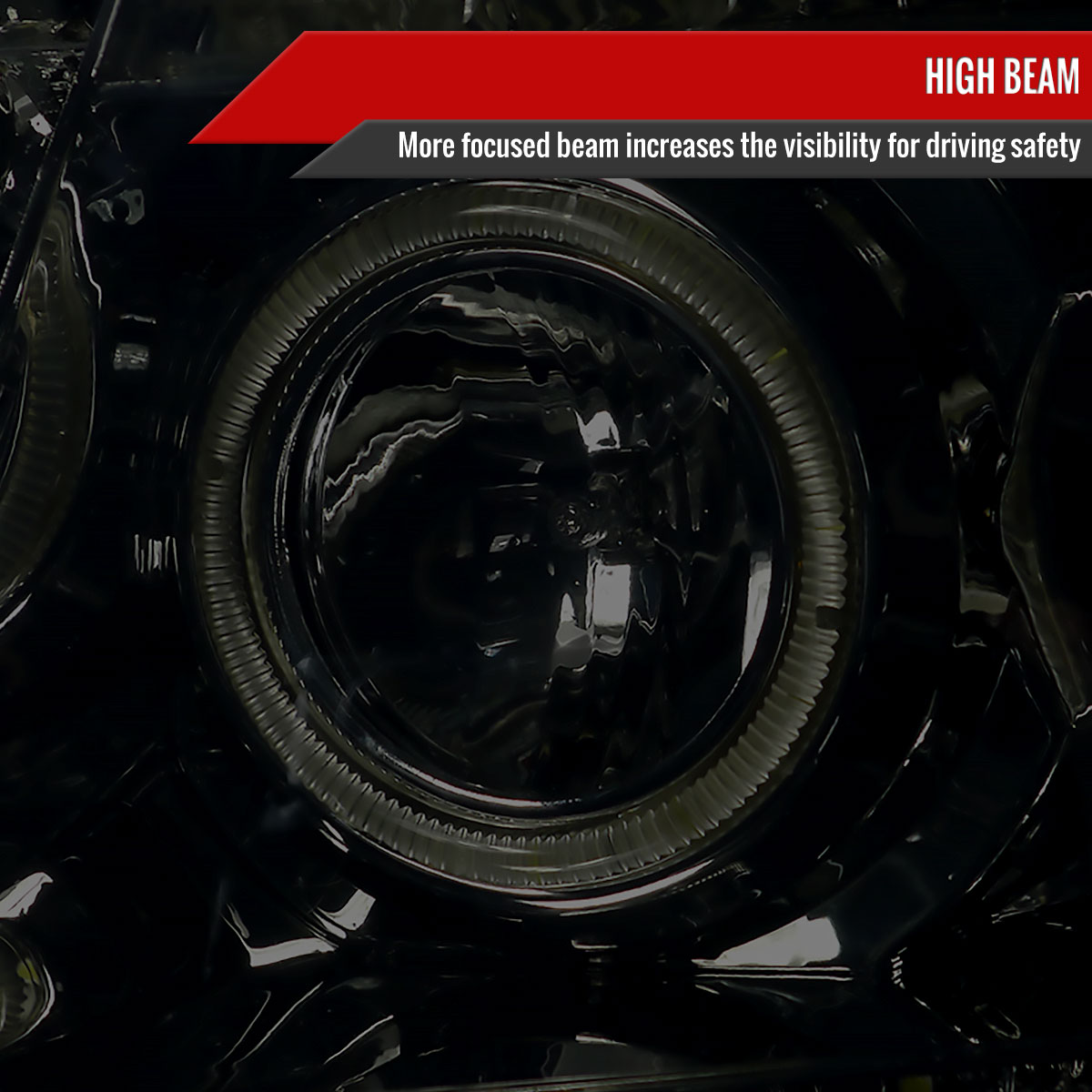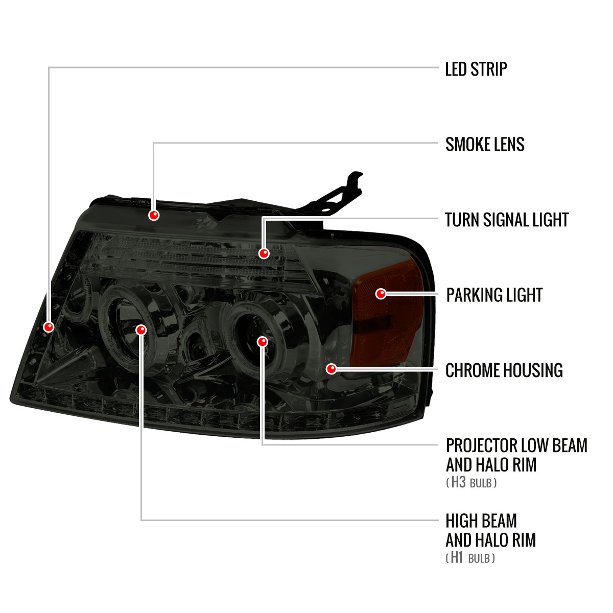 Advanced visibility. Designed for 2004-2008 F-150 trucks, these dual halo projector headlights deliver focused light with an LED strip, paired with a smoked lens for a sleek, custom aesthetic.