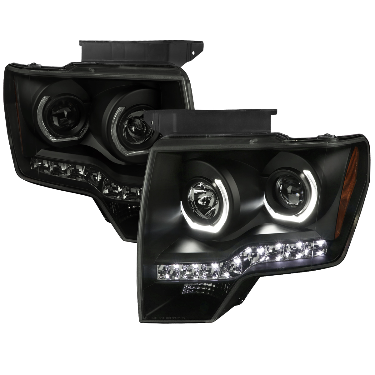 Spec-D Tuning's Dual U-Ring Halo Projector Headlights with black housing and smoked lens, featuring an LED light strip, add a bold, custom edge to your F-150. Crafted for 2009-2014 Ford F-150 models, these headlights enhance both style and function.