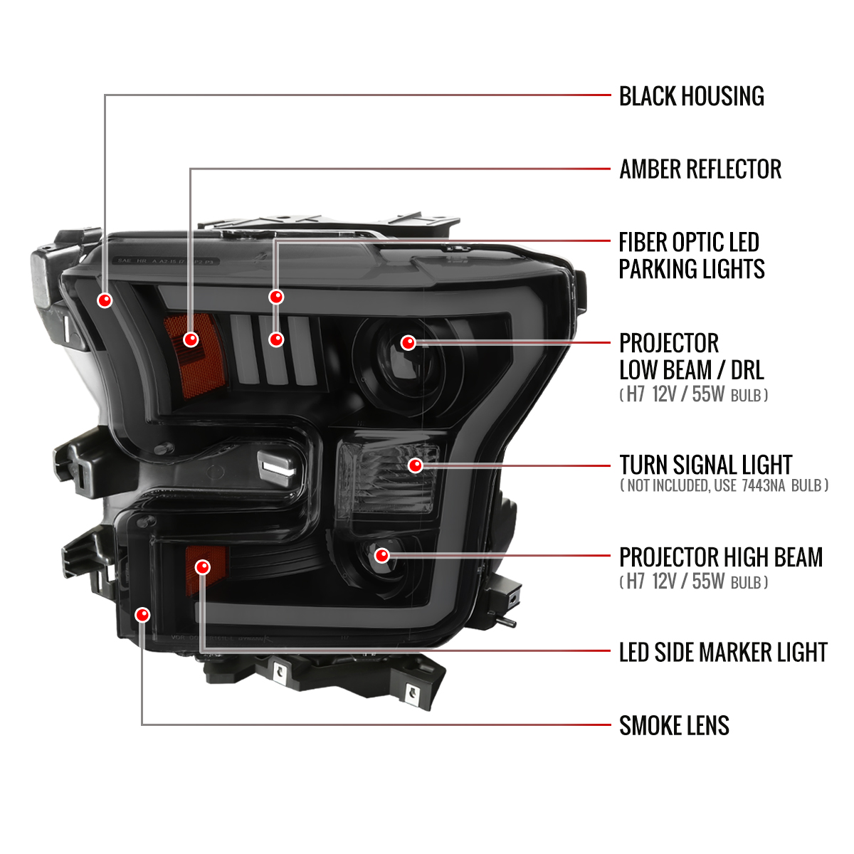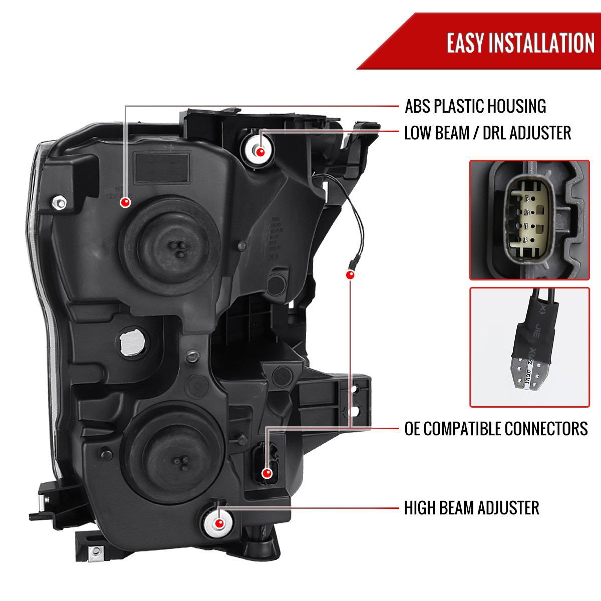 Optimal Brightness. These headlights use projector technology for sharper, brighter light output, while the LED bars enhance visibility and add a unique aesthetic to your F-150.