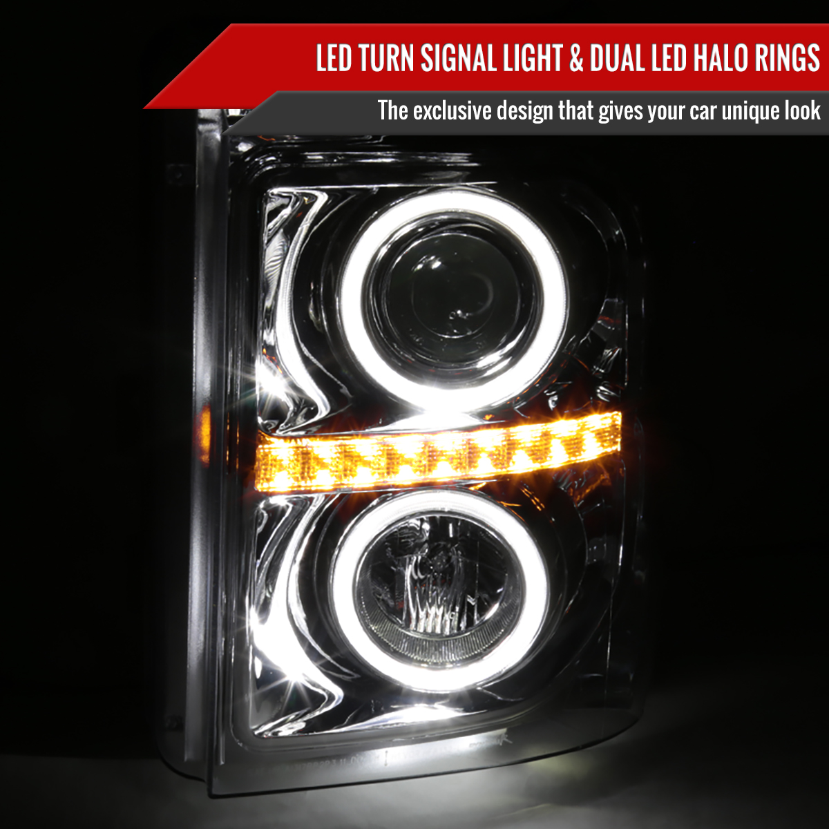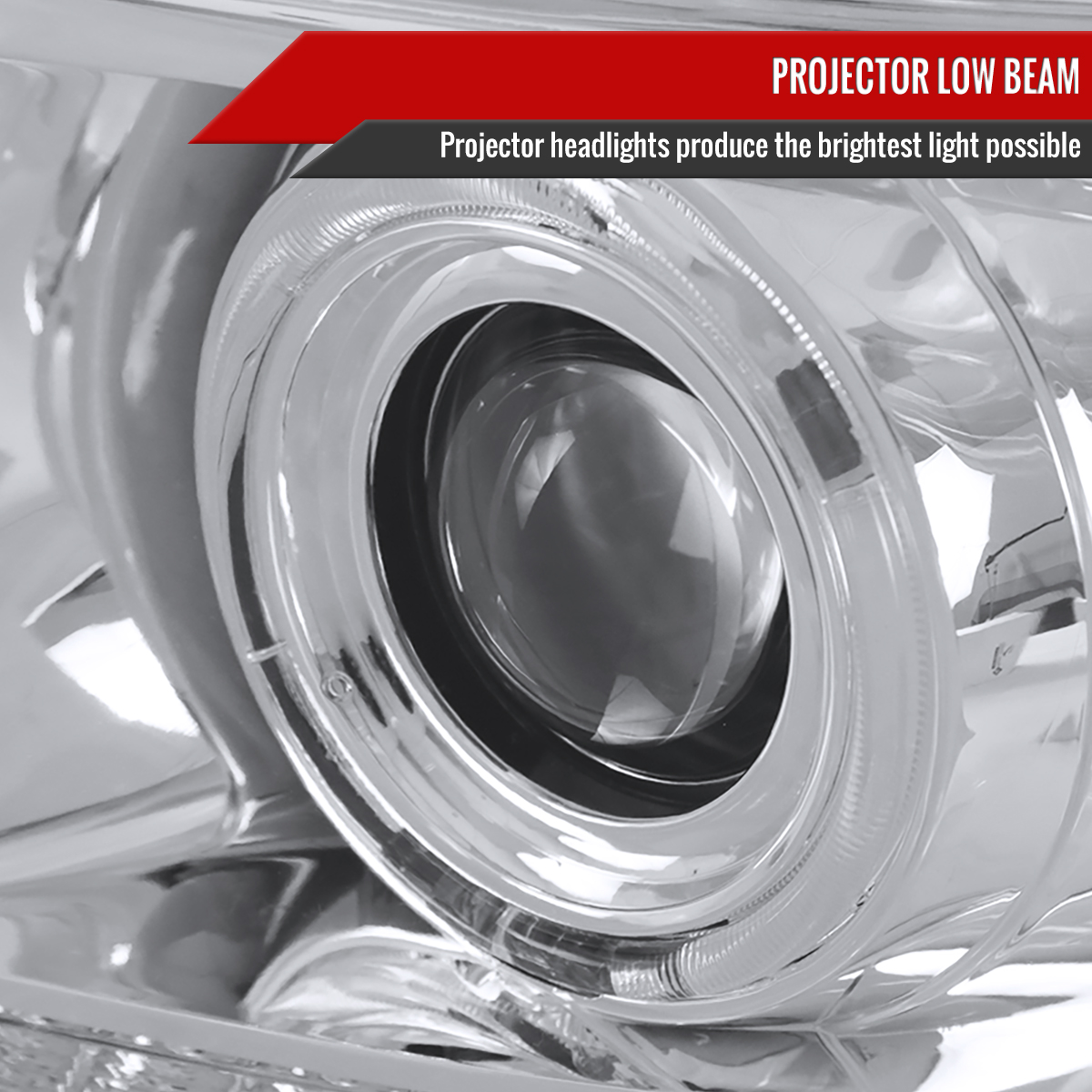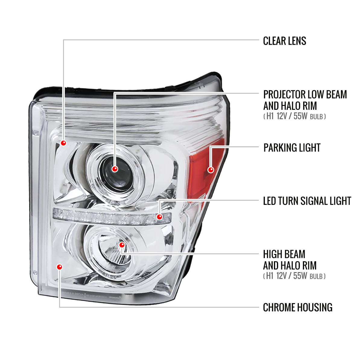Spec-D Tuning's Dual Halo Projector Headlights with chrome housing and clear lens, featuring LED turn signals, elevate your F-250’s look and performance. Designed for 2011-2016 Ford F-250 models, these headlights are a standout choice.