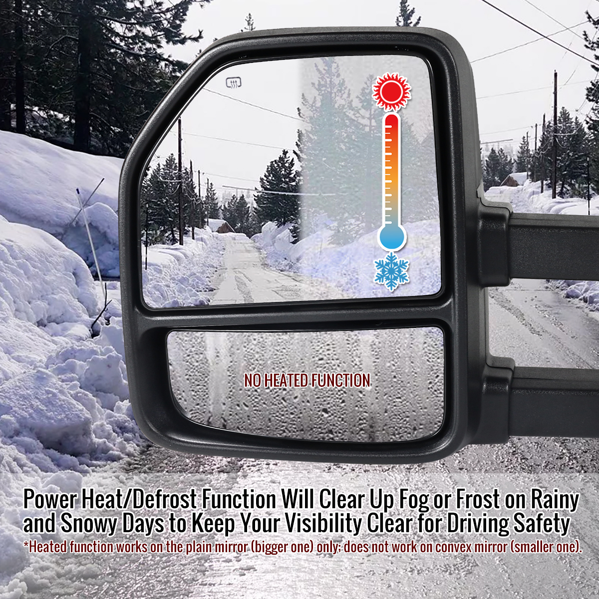 Durable construction. Built with a rugged black housing, these mirrors resist corrosion and harsh conditions. The heated feature ensures clear visibility, making them a reliable F-250 upgrade.