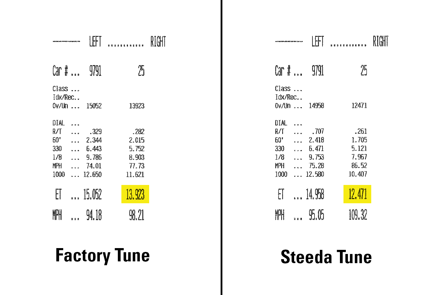 - Nearly 1.5 second faster 1/4 mile times (-1.42s on our test vehicle on the street, and -1.45 at the track)