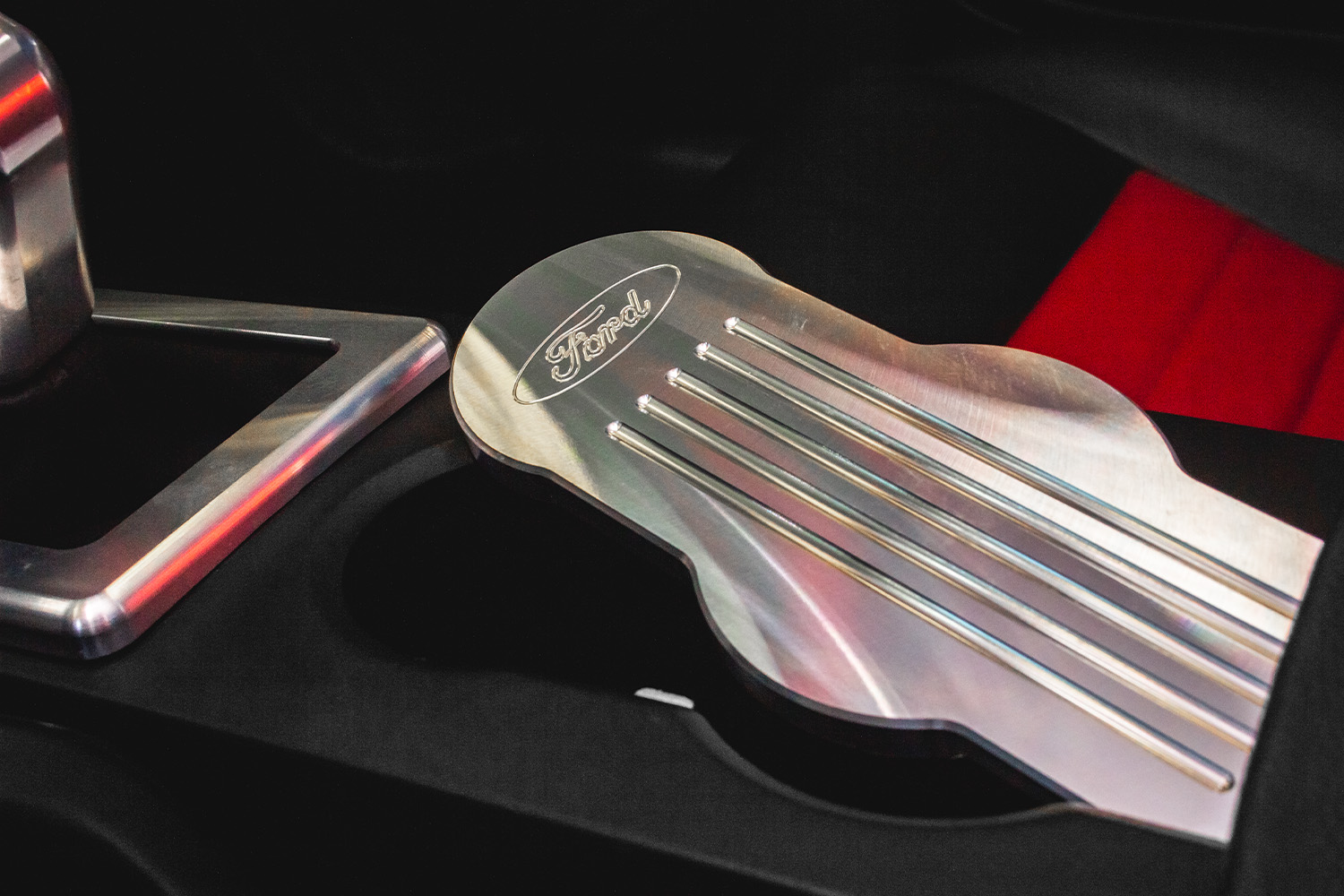 Here's some handsome interior styling for the cockpit of your S197 Mustang, the billet cup holder delete. These are precisely machined in our in-house machine shop from billet 6061 aluminum. Available in 3 different styles, engraved with the Steeda logo, Ford logo or plain with a ball milled finish.