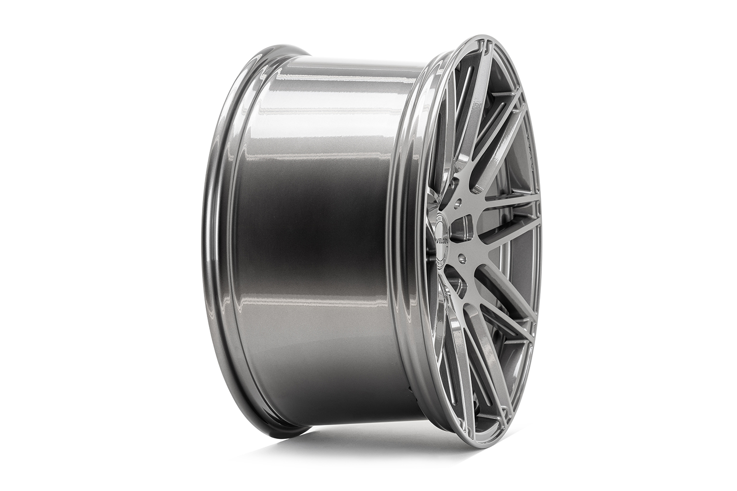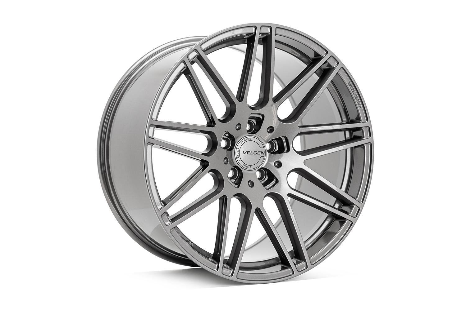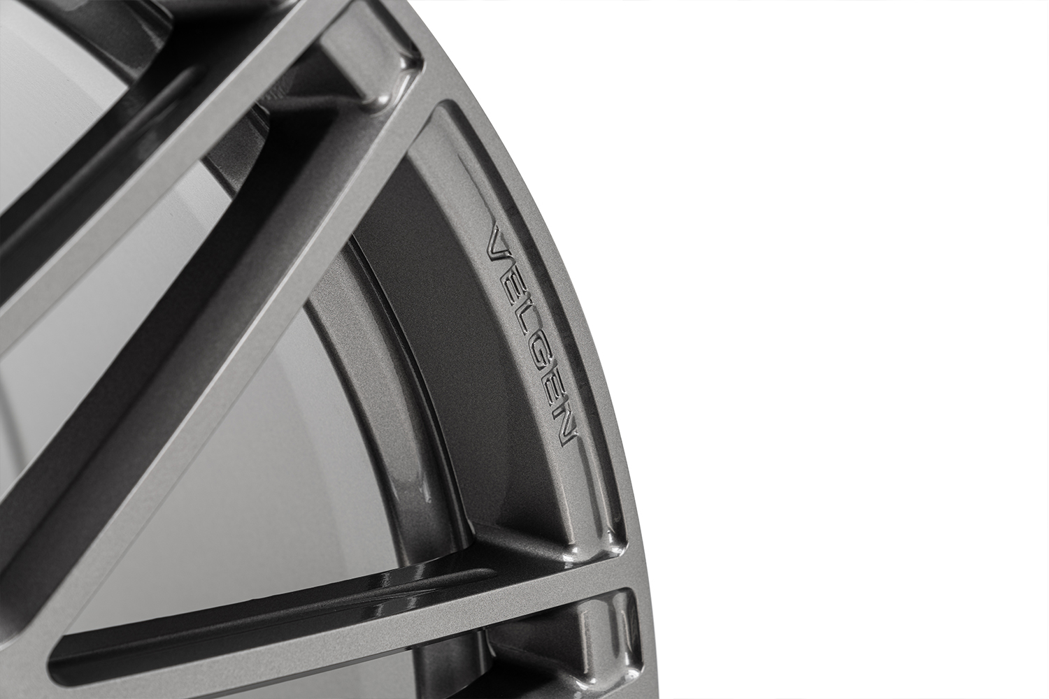 Gloss gunmetal finish. Velgen's gloss gunmetal finish goes well with any paint color and is the perfect way to make your build stand out. The finish features a slight metal flake that really makes the details in the VF9 wheels pop. The design Velgen used almost gives the impression of a multi-piece wheel. Floating spokes meet the wheel at the lip and feature an engraving along the side of the spoke for extra detail. The lug nuts tuck away in unique CNC machined lug holes.